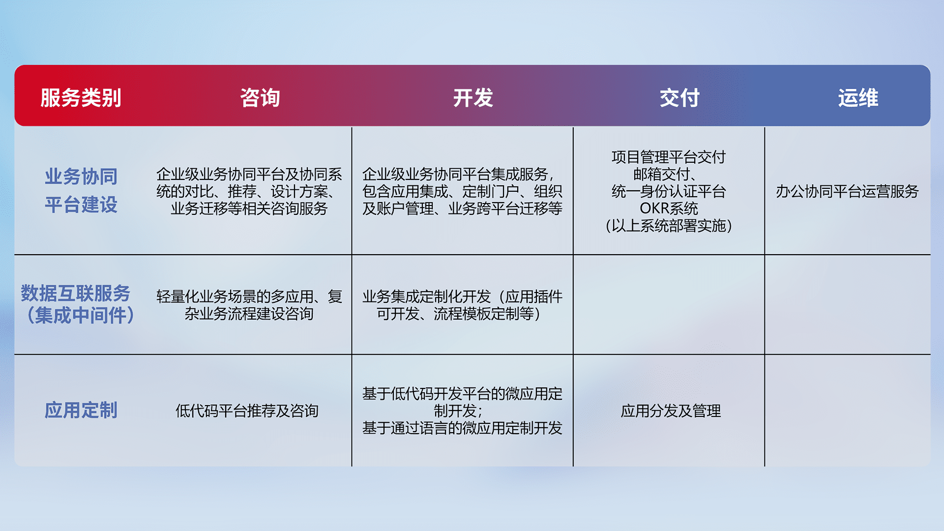 针对钉钉、、企微、、、IDaas等平台级产品提供产品的规划、、、方案、、、、交付、、、、定制化开发等服务,,,实现如统一协同办公、、、、智能客户服务、、、混合会议管理、、、智能数据查询、、、、等业务场景,,,实现数字化转型。。