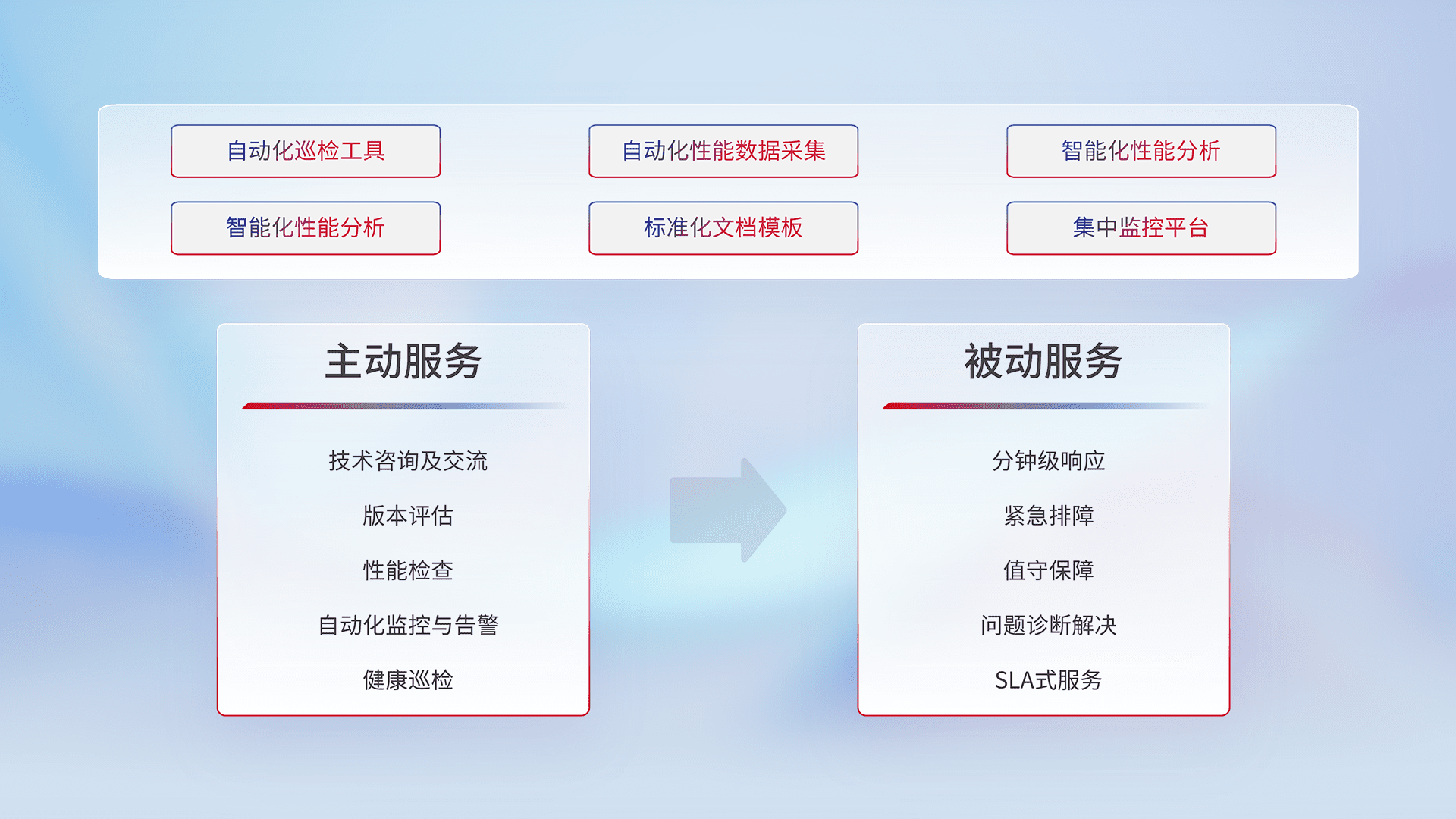 智能化工具和标准化文档,,,保障服务质量,,,,提供主动服务(包含技术咨询、、版本评估、、性能检查、、、、自动化监控与告警、、健康巡检)和被动服务包含(分钟级响应、、紧急排障、、、、值守保障、、、问题诊断解决、、、SLA服务)。。